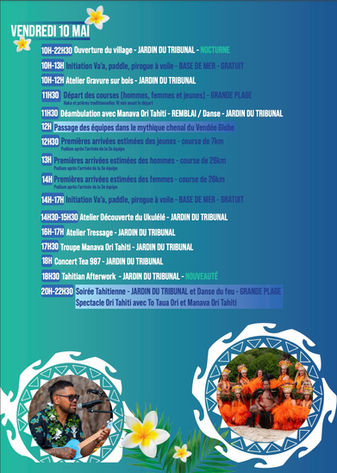 Du mercredi au samedi, un village polynésien de la Vendée Va’a fait découvrir les richesses et les savoir-faire ancestraux de la Polynésie. Retrouvez les créations Mg Fenua Création ainsi qu'Une vingtaine d’exposants qui vous présenteront leurs produits polynésiens.